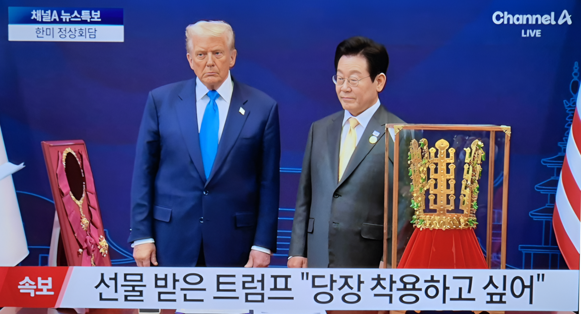 ▲ 이 대통령은 트럼프 대통령에게 무궁화대훈장과 신라 금관 모형을 선물했다. ⓒChannel A