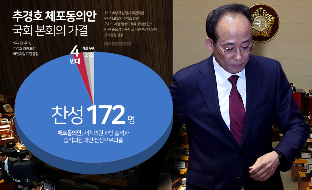 한편 법무부는 12·3 비상계엄 해제 의결을 방해한 의혹을 받는 추 의원에 대한 체포동의안을 지난 7일 국회에 제출했고, 13일 국회 본회의에 보고됐다. 이후 국회 본회의에서 추 의원에 대한 체포동의안은 투표수 180표 중 가 172표, 부 4표, 기권 2표, 무효 2표로 가결됐다.