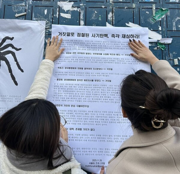기독 보수주의 연구·활동 단체인 트루스포럼(대표 김은구)은 지난 26일 서울대학교 중앙도서관 게시판 등 학내 주요 게시판 6곳에 '거짓말로 점철된 사기탄핵, 즉각 재심하라!'란 제목의 대자보를 부착했다고 밝혔다. 트루스포럼은 이번 대자보를 통해 "윤석열 대통령 탄핵심판을 인용하는 중대하고 결정적인 증거들이 형사재판 과정을 통해 모두 거짓임이 드러났다"며 "핵심 사실들이 허위로 드러난 이상 즉각적인 재심이 불가피하며 거짓 선동을 주도한 세력에 대한 철저한 심판이 있어야 할 것"이라고 강조했다.