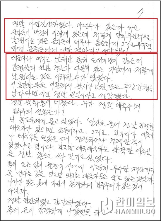 ▲ 1980년 5·18 당시 무장폭도들에게 포위돼 고립된 채로 죽음의 공포에 떨었던 1118야전공병단 185공병대대 2중대 이○○ 상병은 자필 체험수기에서 “군인들이 버젓이 이렇게 있는데 저렇게 안하무인격으로 날뛴다는 것은 군인들이 너무나 온순하게 그리고 무기력하게 군중들에게 대한 결과”라며 “더군다나 간첩들의 침입 경로가 다분히 있는 남해안 도서지방에 혼란한 틈을 이용해 북괴가 남침 또는 무장간첩을 남파하면 이건 정말 큰일이어서 울화통이 터졌다”고 분노했다. 그러면서 “누가 정말 애국자며 민주주의 선봉자인가”라고 물었고 말로만 애국하는 얄팍한 애국심에 대해선 “정말 총으로 쏴 갈기고 싶었다”고 격앙된 감정을 애써 감추지 않았다. / 단독 입수 계엄군 자필수기 캡처
