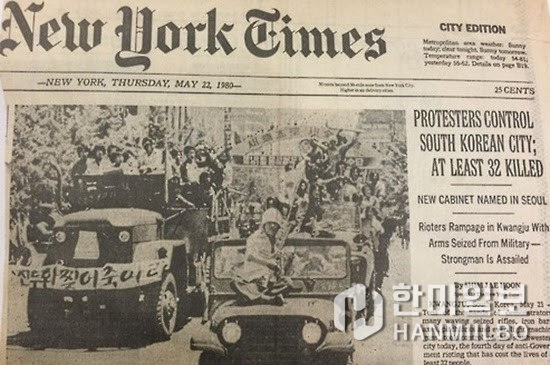 ▲ 시위대가 남한의 도시(광주)를 접수했다는 뉴욕타임스 1980년 5월22일자 헤드라인 아래로 ‘군으로부터 무기를 탈취한 폭도들이 미쳐 날뛰고 권력자는 위협(습격)받고 있다(Rioters rampage with arms seized from Military - strongman is assailed)’는 부제목이 달려 있다.