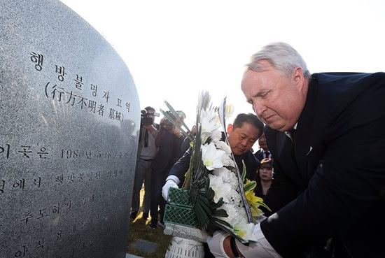▲ 인요한 전 국민의힘 혁신위원장은 5·18 유공자가 돼주면 3억 원을 받게 해 줄 테니 소개비를 달라고 요구받았지만, “5·18 당시 통역만 했을 뿐인데 유공자를 신청할 이유가 없다”는 취지로 말하며 단호하게 뿌리친 것으로 나타났다. 이는 5·18 민주화운동이 얼마나 왜곡돼 있는지를 실증하는 사례로 회자된다. 사진은 인 전 위원장이 현직 시절인 2023년 10월 광주 북구 국립5·18민주묘지 행방불명자 묘역에 헌화하는 모습. 연합뉴스
