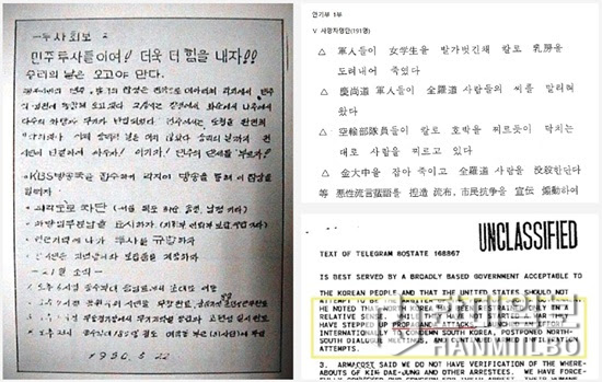▲ 1980년 5·18을 전후해 광주 지역에 유포된 각종 유언비어가 민심을 호도하고 계엄군에 대한 적개심을 키웠다고 미 정보당국이 판단했다. ‘전국 각지에서 동참해 오고 있다’고 가짜 뉴스로 선동하는 유인물(왼쪽)과 국가안전기획부가 추린 유언비어 유형(오른쪽 위), 북한의 프로파간다 공격이 강화되고 있음을 지적한 미 국무부 차관보의 기밀문서. 특히 연구가들은 5·18의 4대 악성 유언비어는 △전두환이 공수부대원에게 환각제를 먹였다 △여학생을 발가벗긴 채 세워놓고 칼로 유방을 도려내어 죽였다 △임산부의 배를 찔러 태아를 꺼냈다 △공수부대가 광주 시민 70%를 죽여도 좋다는 구호를 공공연히 외치고 있다로 압축한다. 근거 없이 떠도는 유언비어는 ‘양치기 소년’의 거짓말 정도로 치부해 버렸어야 했지만 당시엔 파급력이 있었고 여전히 정설처럼 믿는 이들도 있다.