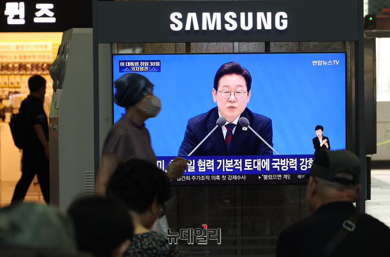 ▲ 대통령 취임 30일을 맞은 이재명 대통령이 지난 3일 오전 청와대 영빈관에서 기자회견을 진행한 가운데 용산역 대합실에서 시민들이 회견을 시청하고 있다. ⓒ정상윤 기자