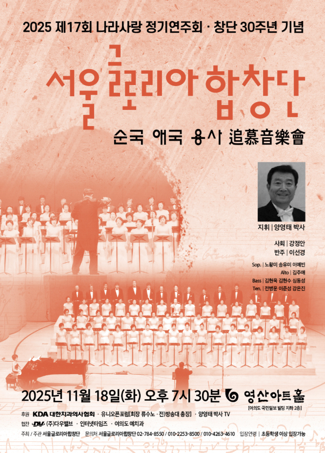 양영태 원장(여의도 예치과)이 단장이자 상임지휘자인 서울글로리아합창단의 ‘2025 제17회 나라사랑 정기연주회’가 오는 11월 18일 저녁 7시 30분 영산아트홀에서 열린다.