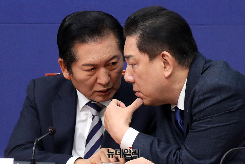 ▲ 정청래 더불어민주당 대표와 김병기 원내대표가 지난 21일 오전 국회에서 열린 최고위원회의에서 대화를 나누고 있다. ⓒ이종현 기자